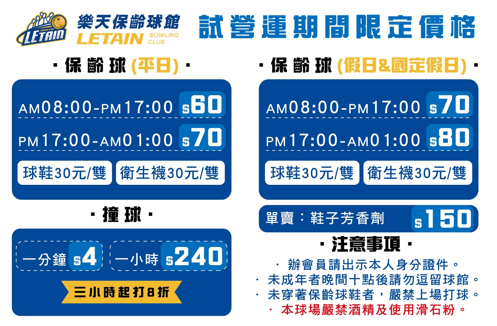 撞球租借|每分鐘 $4(約 $240/時),滿 3 小時再享 8 折優惠